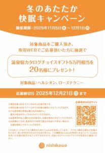 11月5日(水)~ 対象商品をご購入頂き、専用WEBでご応募頂いた方に抽選で温泉宿カタログチョイスギフト5万相当を20組様にプレゼントします。